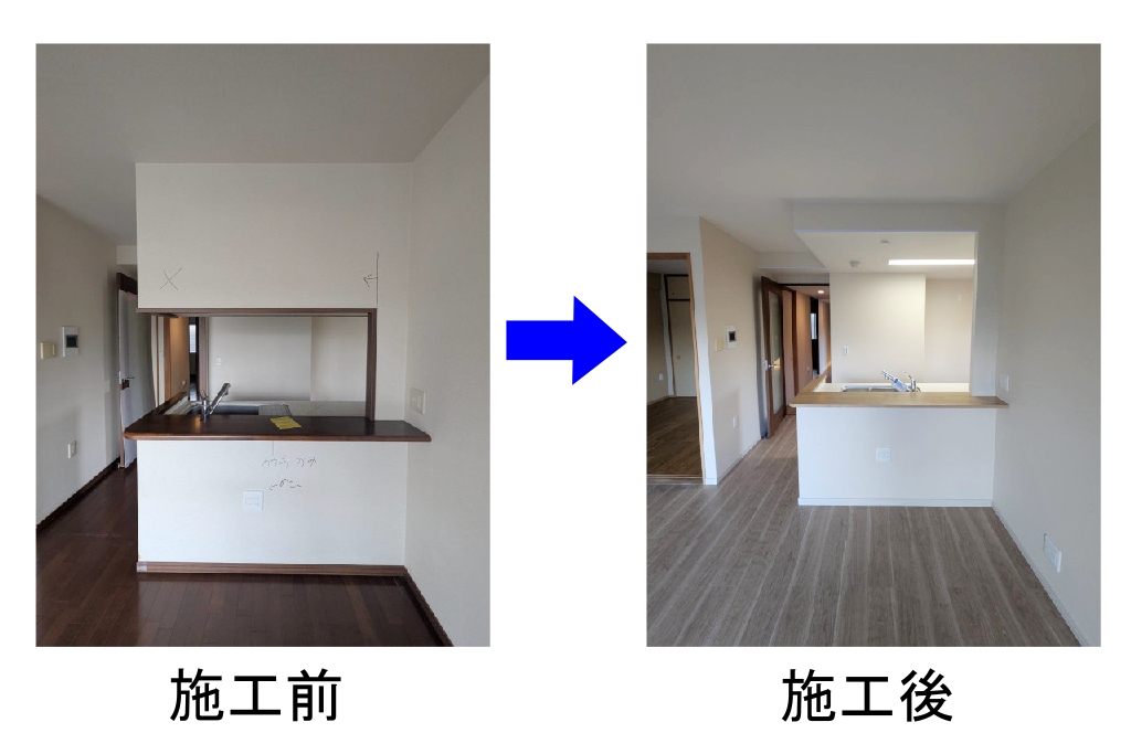 別の角度(キッチンを正面に見た)からの写真です。頭上部分にあった壁もなくしましたので、上からの圧迫感が軽減しています。