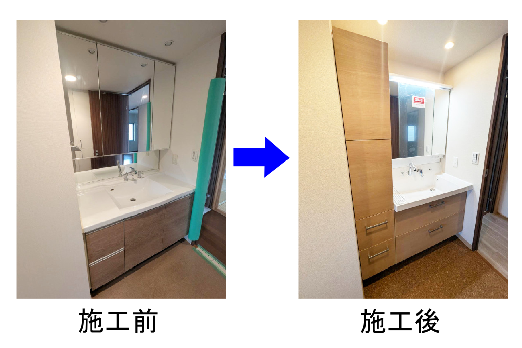 ライフスタイルの変化によって、洗面の広さよりも収納に重点を置いたリフォームです。